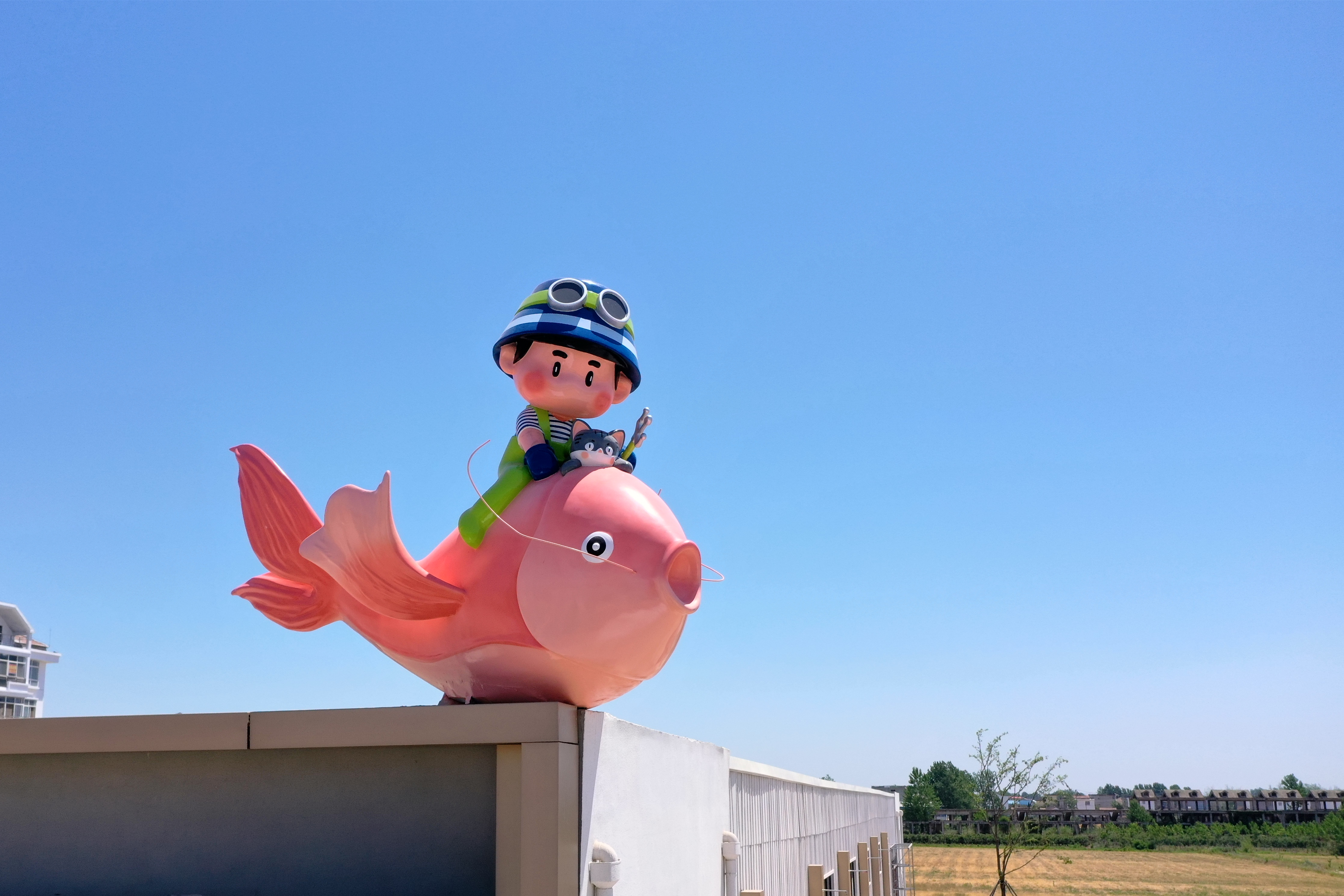 在石梁鮮街,石小海騎著粉色大魚自歡墩美食城頂端瞭望,特色餐飲店里的魚肴散發(fā)濃香,雕塑裝點(diǎn)下的大魚海Town廣場生機(jī)蓬勃,巨幅彩色主題彩繪上,喵小良陪著石小海乘風(fēng)破浪,陽光灑下,彩繪的大魚仿佛閃著粼光。