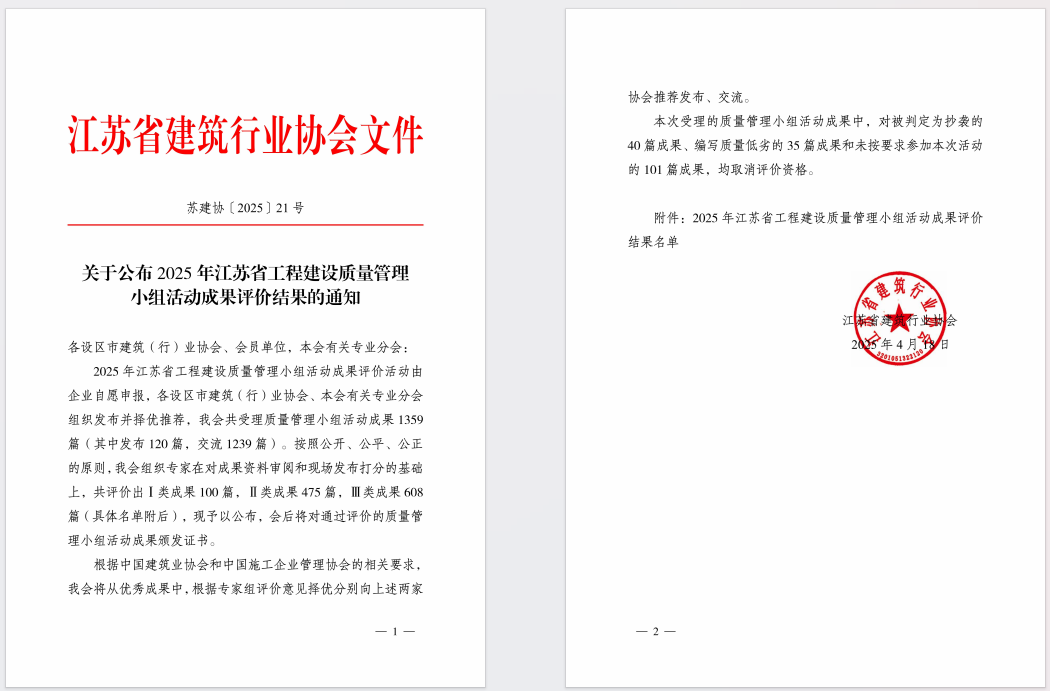 近日,江蘇省建筑行業(yè)協(xié)會公布2025年江蘇省工程建設質(zhì)量管理小組活動成果評價結(jié)果,海建公司“只爭朝夕”QC小組、“瀛洲南路”QC小組憑借成果《提高鋼筋混凝土路面平整度驗收合格率》及《提高橋梁花瓶墩鋼筋保護層合格率》,在眾多參賽小組中脫穎而出,分別榮獲二類、三類成果獎。