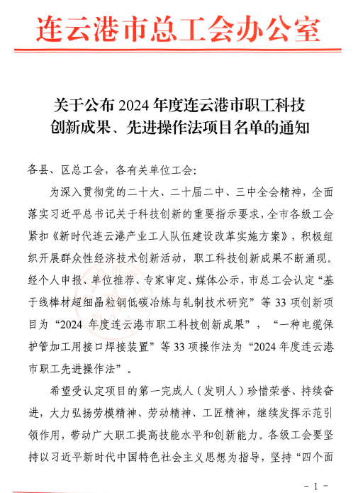 近日,在2024年度連云港市職工科技創(chuàng)新成果、先進操作法作品評選中,豐達公司王越申報的一項創(chuàng)新成果獲市職工科技創(chuàng)新成果三等獎。