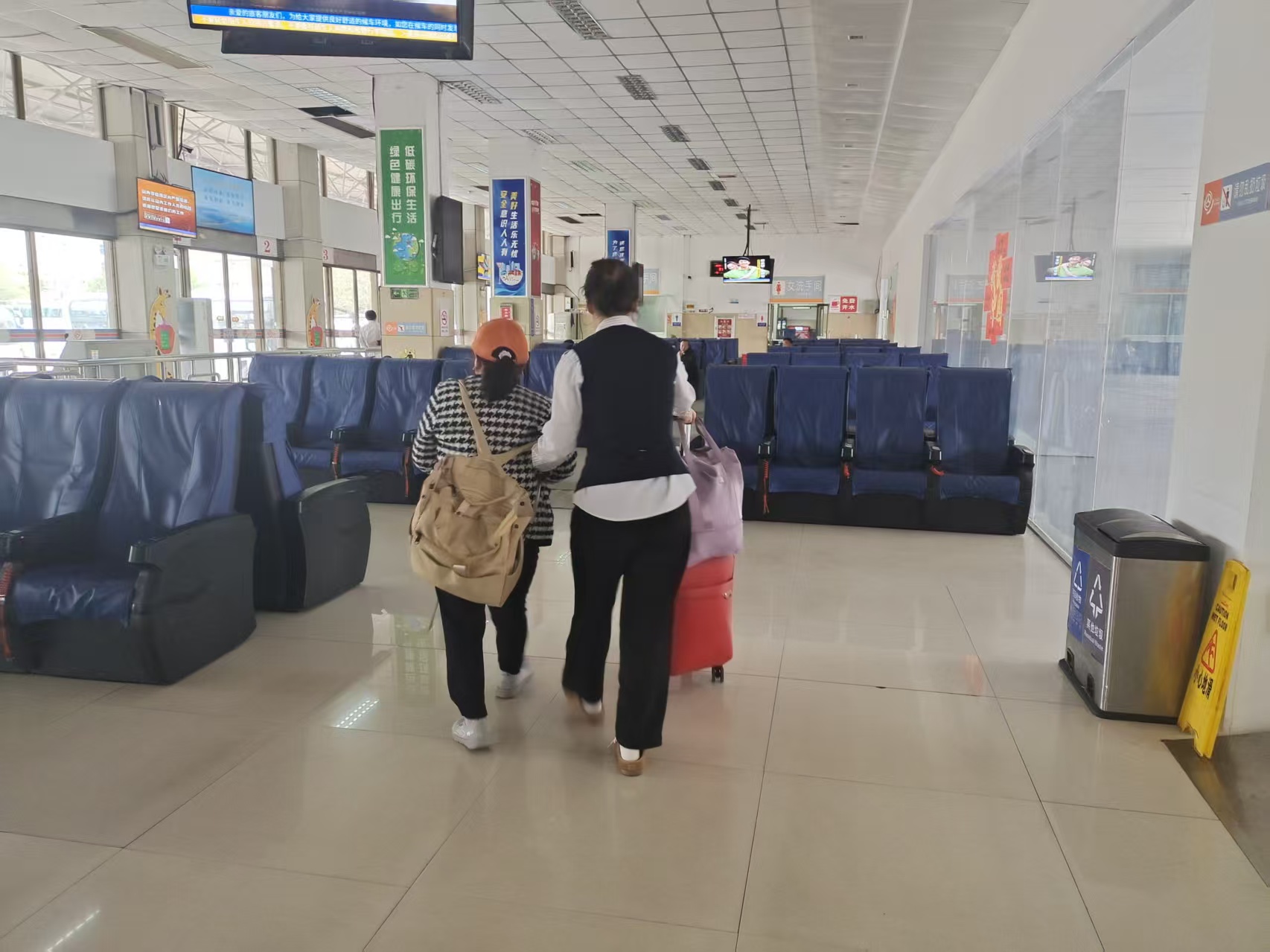 “您好,是要坐車嗎?”駱青立刻快步上前,聲音特意放輕,左手輕輕扶上旅客的胳膊肘,右手順勢接過她手里沉甸甸的布包。原來這位旅客要去沭陽,獨(dú)自出門來蘇欣快客站,剛進(jìn)門就慌了神?!澳鷦e著急,我陪您辦手續(xù)”駱青一邊安撫,一邊扶著她往購票窗口走,每過一個(gè)拐角、上一級(jí)小臺(tái)階,都輕聲提醒:“前面慢一點(diǎn),有個(gè)小坡”“窗口到了,我?guī)湍氵f身份證”。選好了去沭陽的班次,駱青幫著核對(duì)信息,把車票和身份證小心翼翼塞進(jìn)旅客手心:“您拿好,我扶著你去檢票、乘車?!苯又?,駱青拎著布包、行李箱帶旅客過安檢、檢票。上車時(shí),駱青踩著臺(tái)階先幫旅客把行李放好,再扶著她上車坐穩(wěn),不忘叮囑駕駛員:“麻煩您路上多照看一下。”