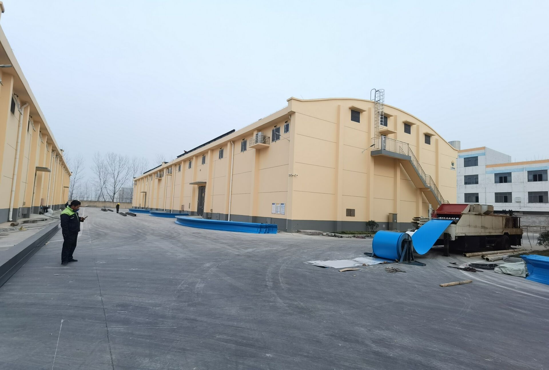 現(xiàn)工程已全面開工,屋頂拱形屋面材料已制作完成,正在焊接兩側(cè)鋼梁,待焊接完成進(jìn)行吊裝作業(yè)。公司總務(wù)處對施工安全問題高度重視,令施工方在作業(yè)前上報施工方案,簽訂安全責(zé)任書,所有施工場地人員均佩戴安全帽,高處施工人員需佩戴安全繩,保證施工作業(yè)安全。預(yù)計該工程元旦前后即可施工完成。