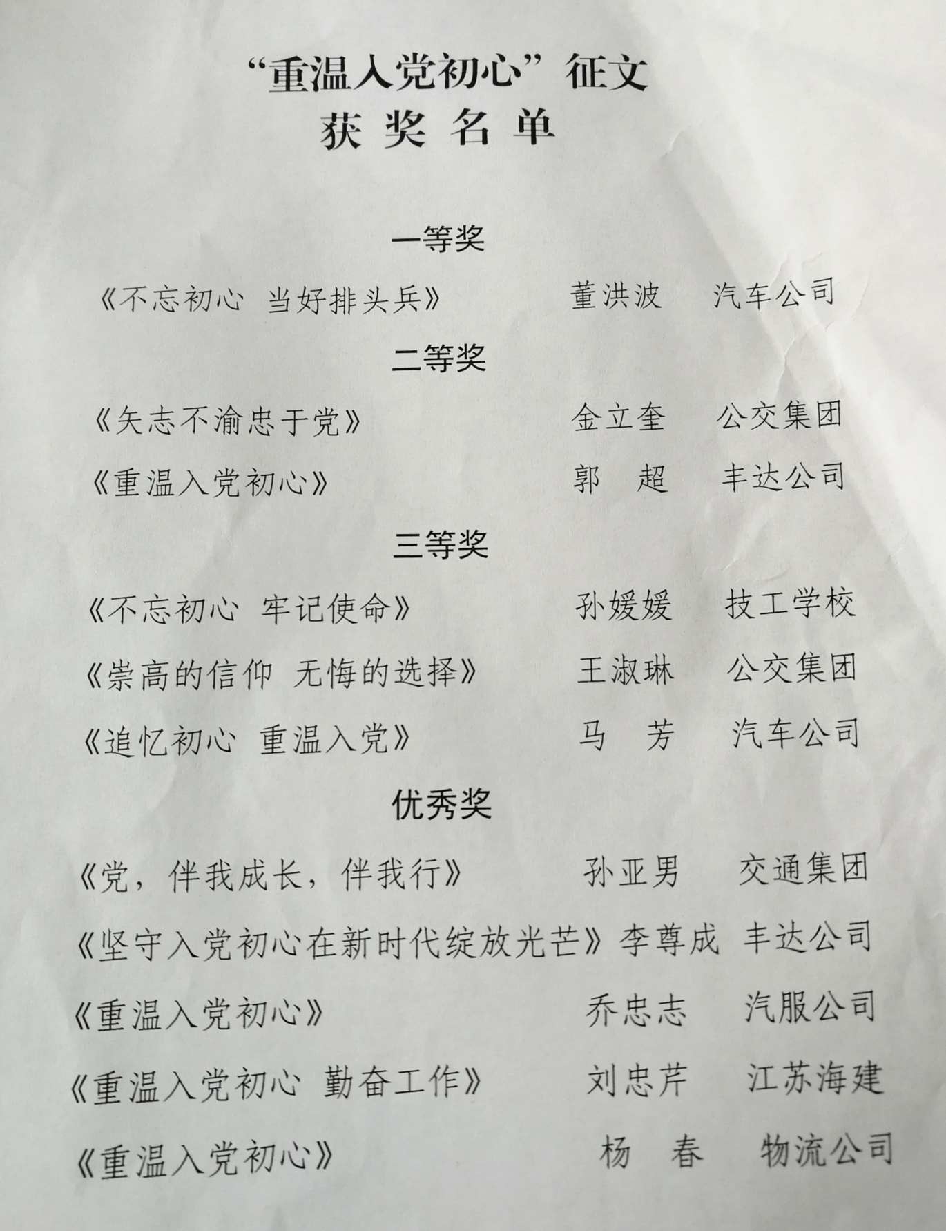 為認(rèn)真學(xué)習(xí)貫徹落實(shí)黨的十九大精神,持續(xù)推進(jìn)“兩學(xué)一做”學(xué)習(xí)制度常態(tài)化制度化,同時(shí)推動(dòng)“與雷鋒車同行”活動(dòng)向縱深開(kāi)展,集團(tuán)先后組織開(kāi)展了“重溫入黨初心”和“傳承美德學(xué)雷鋒,傳倡文明數(shù)新風(fēng)”兩項(xiàng)主題征文活動(dòng),活動(dòng)開(kāi)展以來(lái),豐達(dá)公司廣大干部職工積極向集團(tuán)投稿。經(jīng)評(píng)選,豐達(dá)公司李尊成同志的《樸實(shí)無(wú)華譜青春》榮獲“傳承美德學(xué)雷鋒,傳倡文明數(shù)新風(fēng)”征文二等獎(jiǎng)榮譽(yù),郭操的《重溫入黨初心》一文榮獲“重溫入黨初心”征文比賽二等獎(jiǎng)榮譽(yù)。