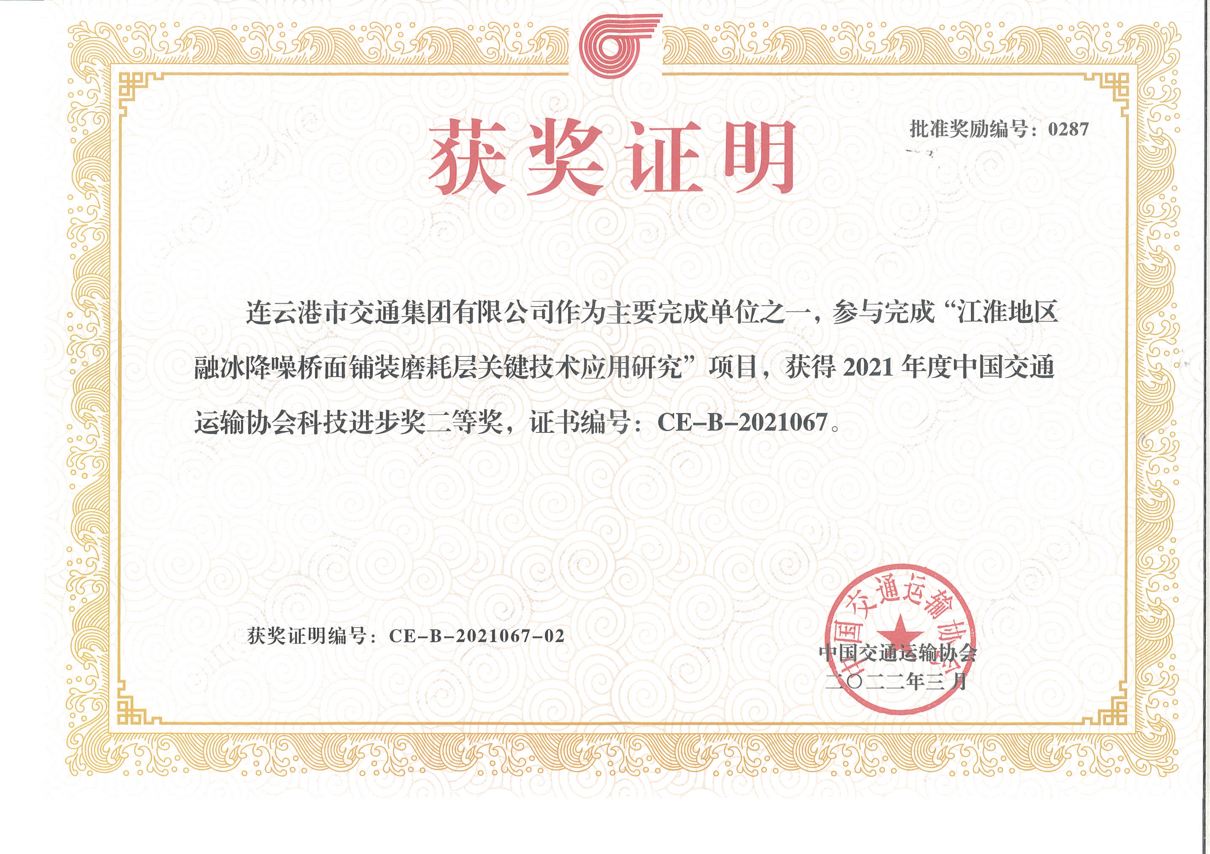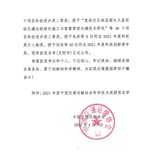 近日,中國(guó)交通運(yùn)輸協(xié)會(huì)發(fā)布了“2021年度中國(guó)交通運(yùn)輸協(xié)會(huì)科學(xué)技術(shù)獎(jiǎng)”獲獎(jiǎng)項(xiàng)目名單,交通集團(tuán)聯(lián)合蘇交科集團(tuán)等單位申報(bào)的“江淮地區(qū)融冰降噪橋面鋪裝磨耗層關(guān)鍵技術(shù)應(yīng)用研究”項(xiàng)目榮獲中國(guó)交通運(yùn)輸協(xié)會(huì)科技進(jìn)步獎(jiǎng)二等獎(jiǎng)。