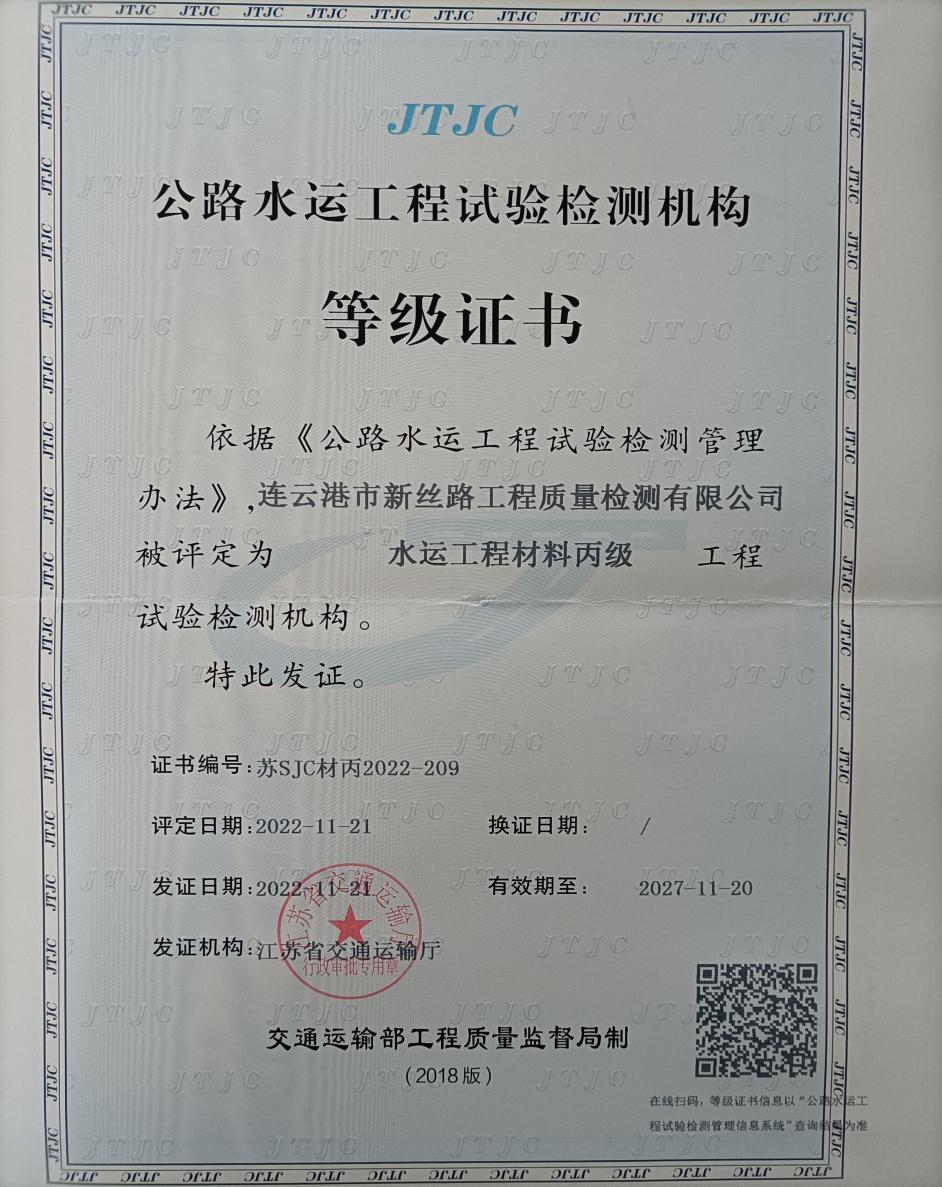 近日,江蘇海建新絲路檢測公司水運工程材料試驗檢測資質,經(jīng)江蘇省交通運輸廳核準,申報成功并取得證書。