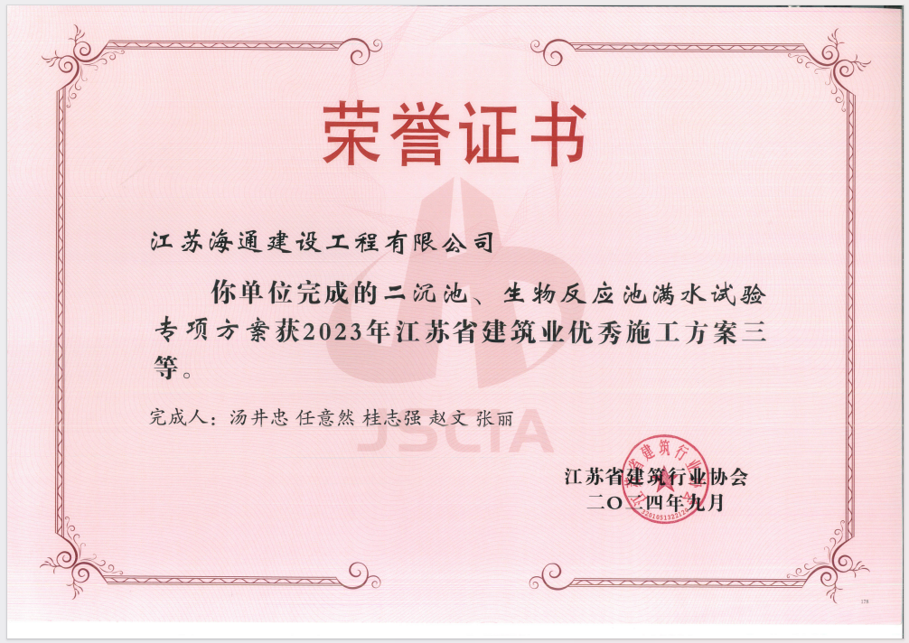 近日,江蘇省建筑行業(yè)協(xié)會(huì)公布了2023年度江蘇省建筑業(yè)優(yōu)秀施工方案評(píng)價(jià)結(jié)果,海建公司申報(bào)的三項(xiàng)施工方案獲得榮譽(yù),其中《預(yù)制箱梁運(yùn)輸安裝專(zhuān)項(xiàng)方案》獲得江蘇省建筑業(yè)優(yōu)秀施工方案二等,《嵌巖方樁專(zhuān)項(xiàng)施工方案》、《二沉池、生物反應(yīng)池滿水試驗(yàn)專(zhuān)項(xiàng)方案》獲得江蘇省建筑業(yè)優(yōu)秀施工方案三等。