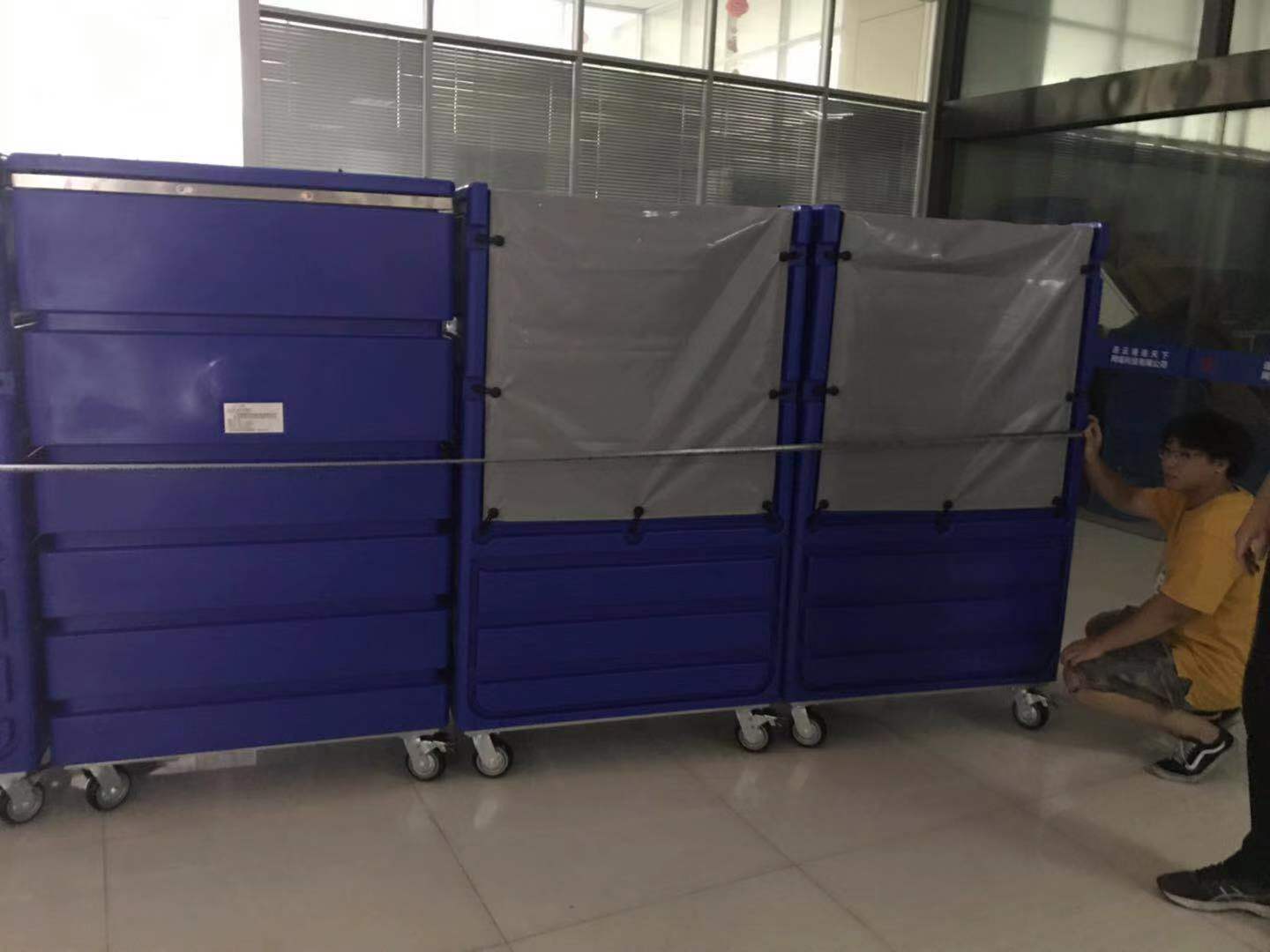 為了適應(yīng)現(xiàn)代化物流運(yùn)輸需求,更好地開展與洗滌設(shè)備公司、酒店、大型洗衣工廠、醫(yī)院、行政單位、洗衣店的配送業(yè)務(wù),提高運(yùn)輸及裝卸效率,提升服務(wù)質(zhì)量,9月5日,連德物流購進(jìn)12輛塑料布草外送籠車。