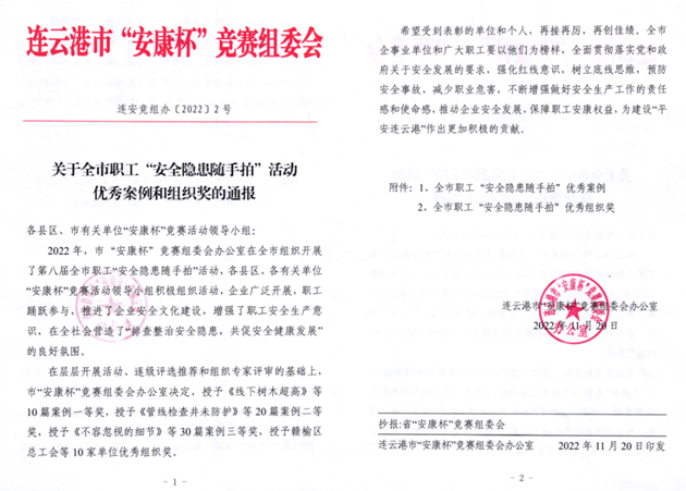 近日,從市“安康杯”競賽組委會(huì)傳來喜訊,交通控股集團(tuán)榮獲第八屆全市職工“安全隱患隨手拍”活動(dòng)優(yōu)秀組織獎(jiǎng),集團(tuán)1名職工榮獲一等獎(jiǎng)、4名職工榮獲二等獎(jiǎng)、3名職工榮獲三等獎(jiǎng)。