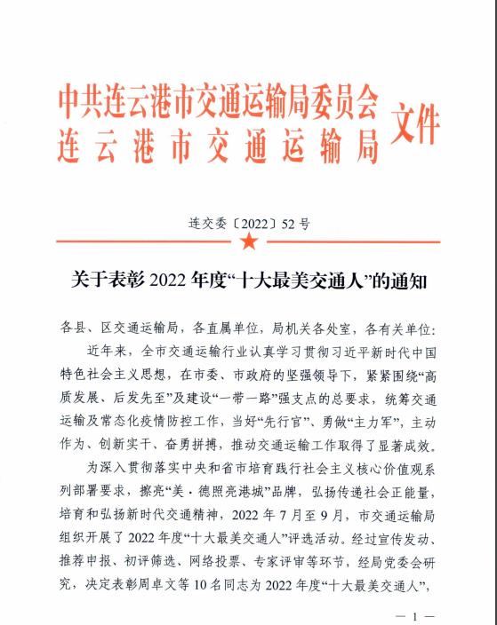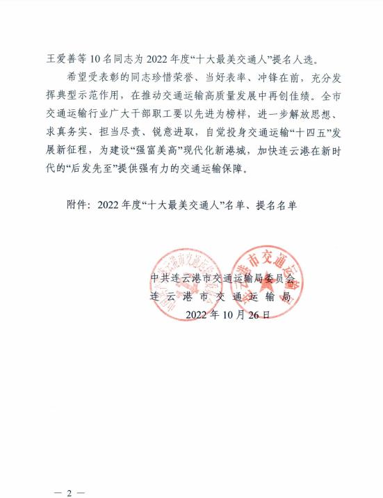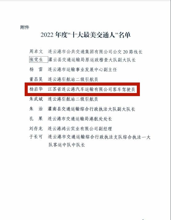 為深入貫徹落實中央和省市培育踐行社會主義核心價值觀系列部署要求,擦亮“美·德照亮港城”品牌,弘揚傳遞社會正能量,培育和弘揚新時代交通精神,2022年7月至9月,市交通運輸局組織開展了2022年度“十大最美交通人”評選活動。經(jīng)過宣傳發(fā)動、推薦申報、初評篩選、網(wǎng)絡(luò)投票、專家評審等環(huán)節(jié),汽車公司客車駕駛員楊啟華勇于擔當、無私奉獻,為推動交通運輸高質(zhì)量發(fā)展做出了積極貢獻,榮獲連云港市2022年度“十大最美交通人”。