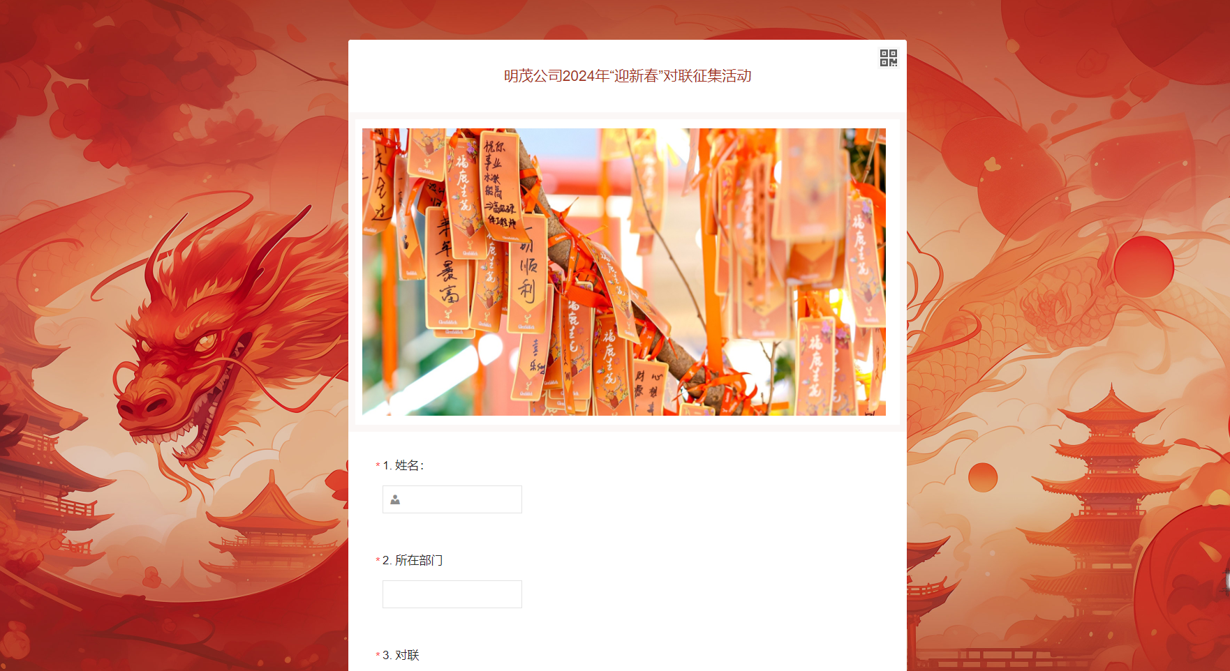 “律回春暉漸,萬象始更新”。龍年即將到來,明茂公司近期開展“迎新春”對聯(lián)征集活動,汲取全體職工智慧,努力在全公司營造歡樂、喜慶、祥和的濃厚節(jié)日氛圍。