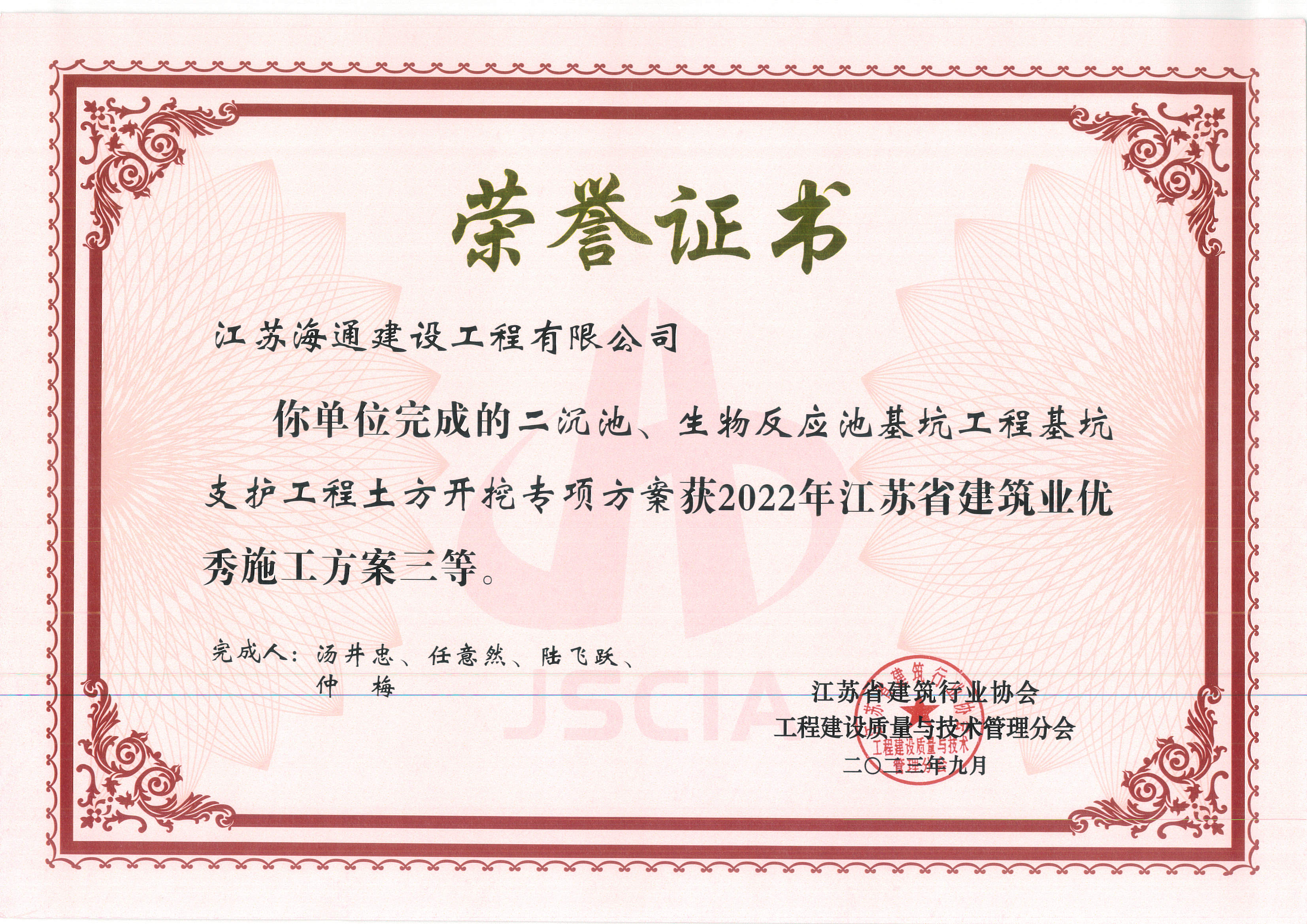 日前,從江蘇省建筑業(yè)協(xié)會獲悉,江蘇海建公司申報的《預(yù)應(yīng)力砼連續(xù)箱梁專項施工方案》和《二沉池、生物反應(yīng)池基坑工程基坑支護(hù)工程土方開挖專項方案》兩項施工方案分獲江蘇省建筑業(yè)優(yōu)秀施工方案二等獎和三等獎。