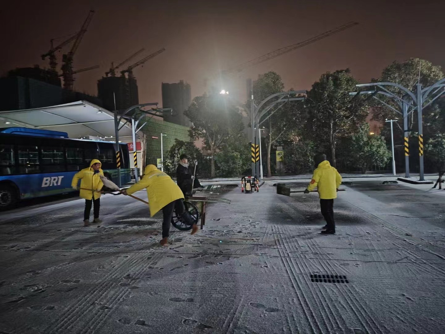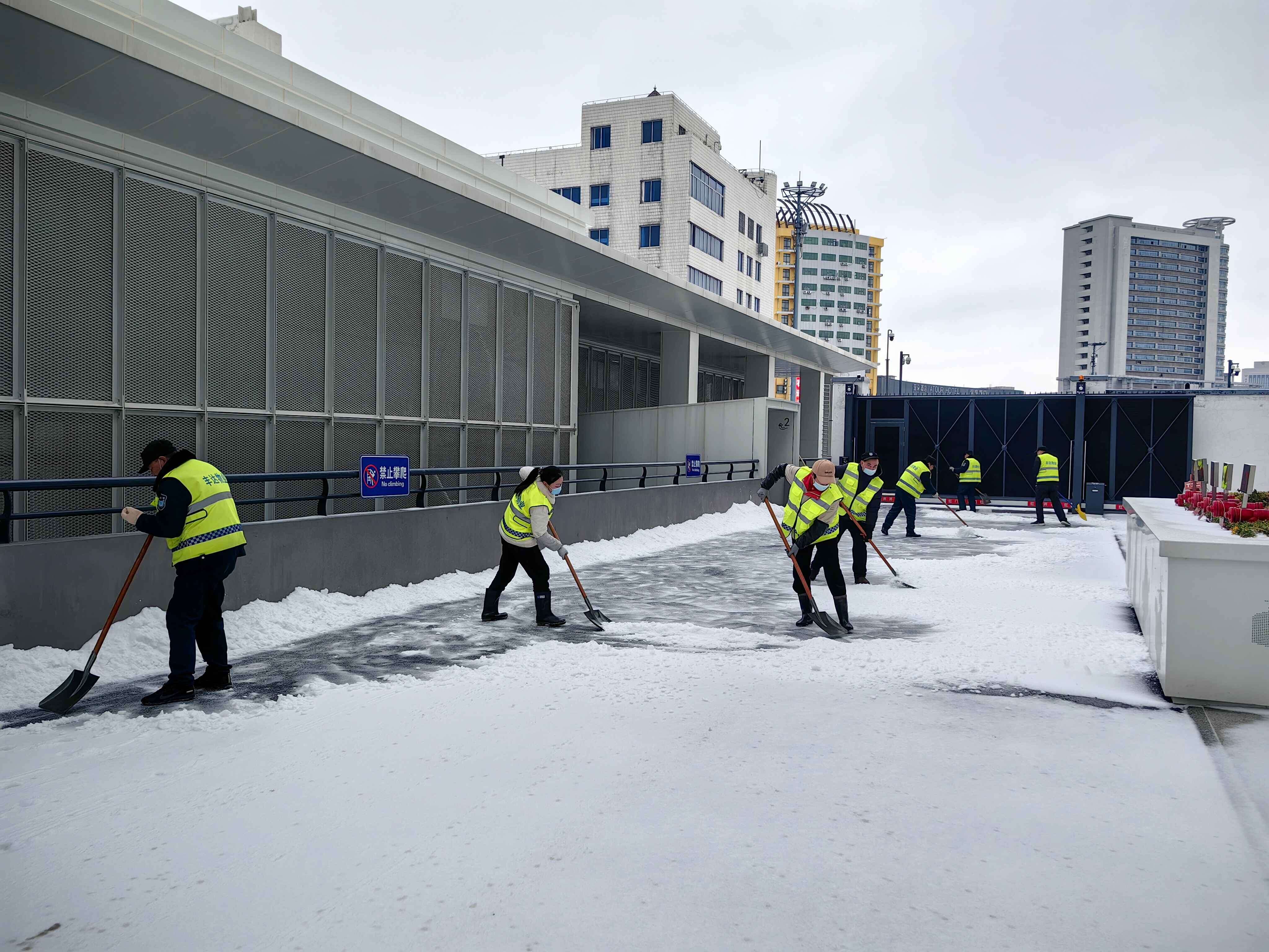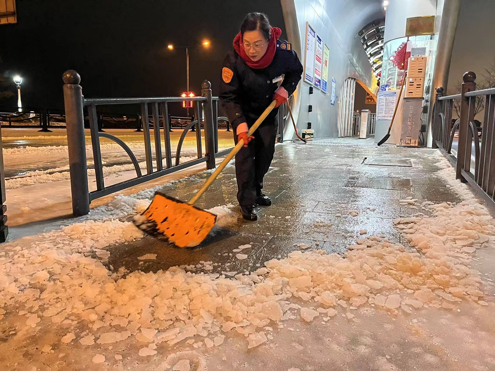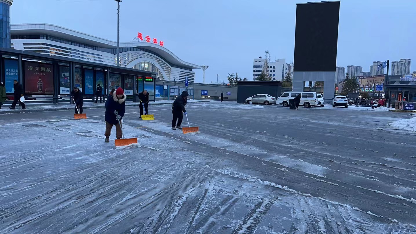 19日15時,交通集團建立了3支應急隊伍,共儲備融雪劑8噸,并及時補充;應急車輛、手推式拋灑機、手推車、除雪機、鐵鍬、掃把等大量工具齊上陣。隨著天氣變化,交通集團于19日21時啟動冬季除雪防滑應急處置預案,一支由18人組成的融雪除冰應急小組迅速行動,冒凍雨開始逐步分段在出入口、人行通道、停車場出入口處等關鍵區(qū)域分段拋灑融雪劑,有效防止了道路結冰,確保了市民旅客的出行安全。20日,融雪除冰應急隊伍增至35人,除雪設備、應急車輛數(shù)量翻倍,綜合客運樞紐現(xiàn)場辦全體干部職工24小時奮戰(zhàn)一線,全域拋灑融雪劑5次,使用融雪劑總量達12噸。連夜的融雪除冰保障了連云港站早班高鐵列車旅客的出行安全。