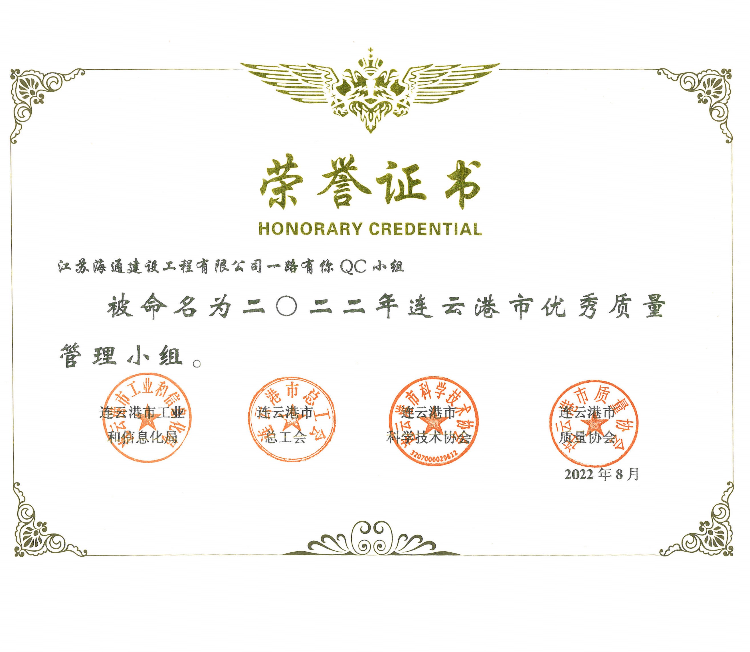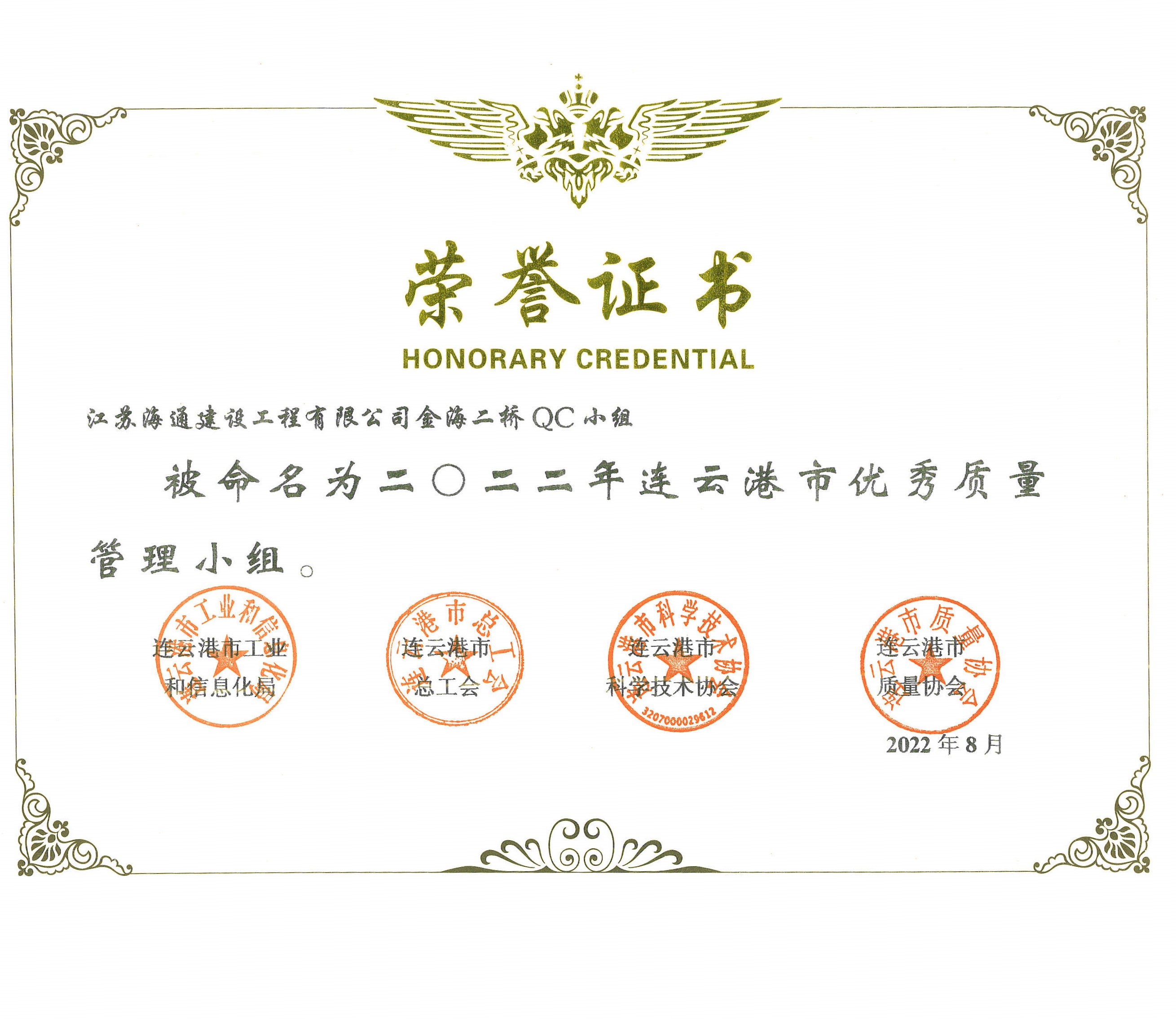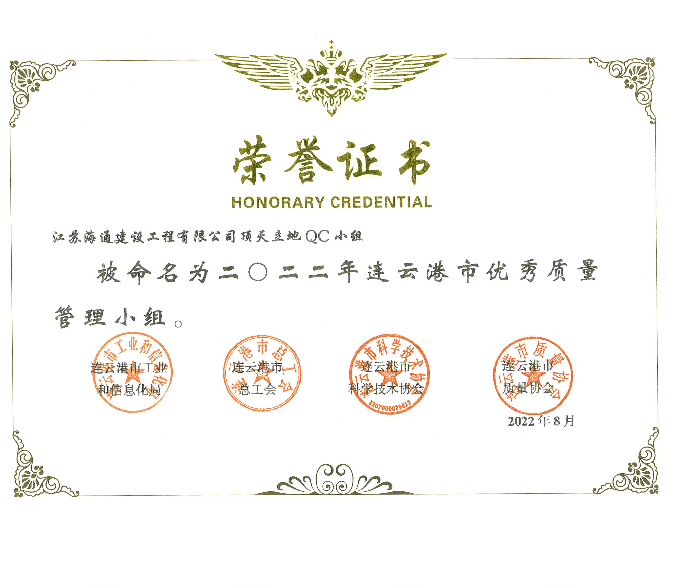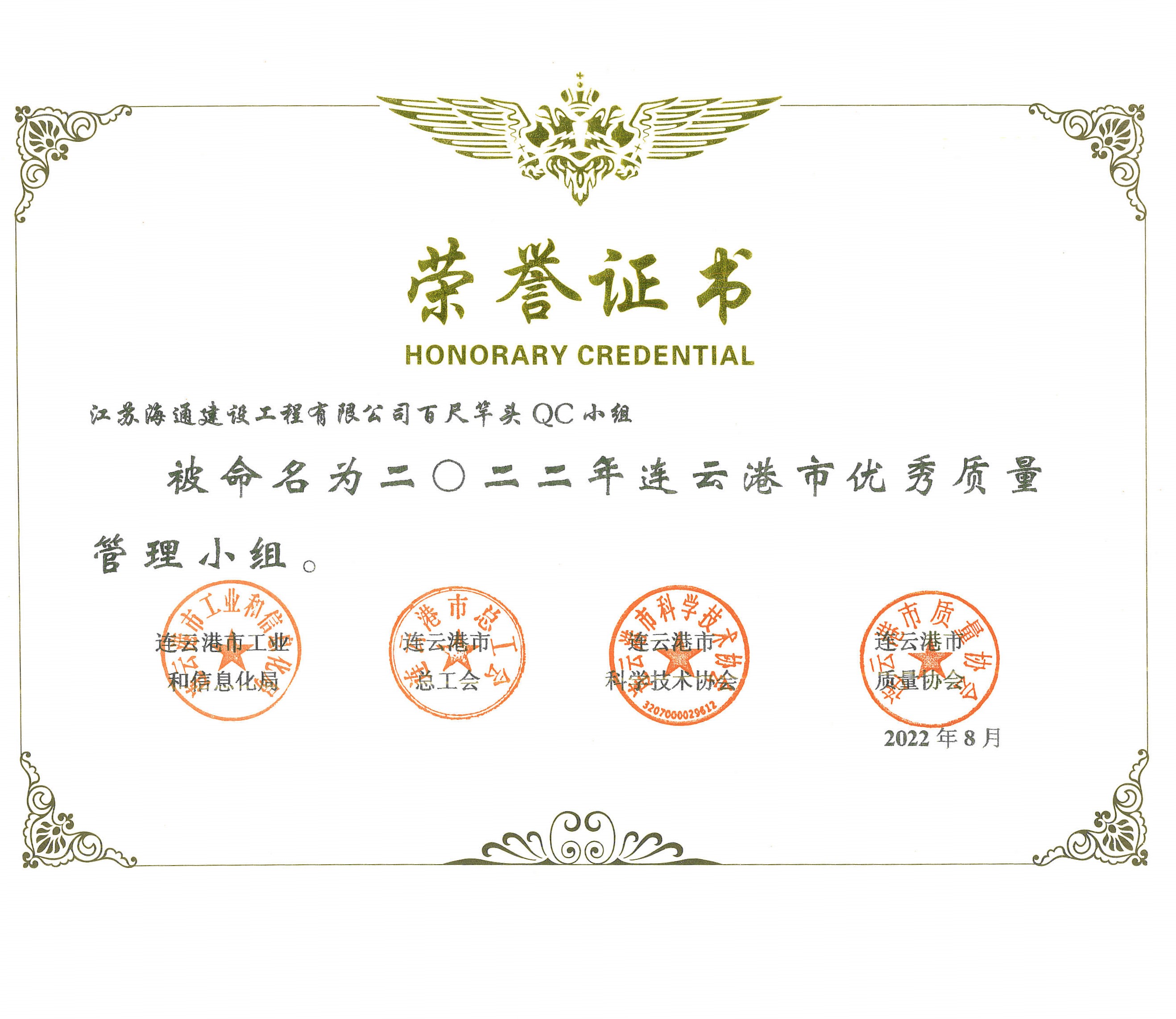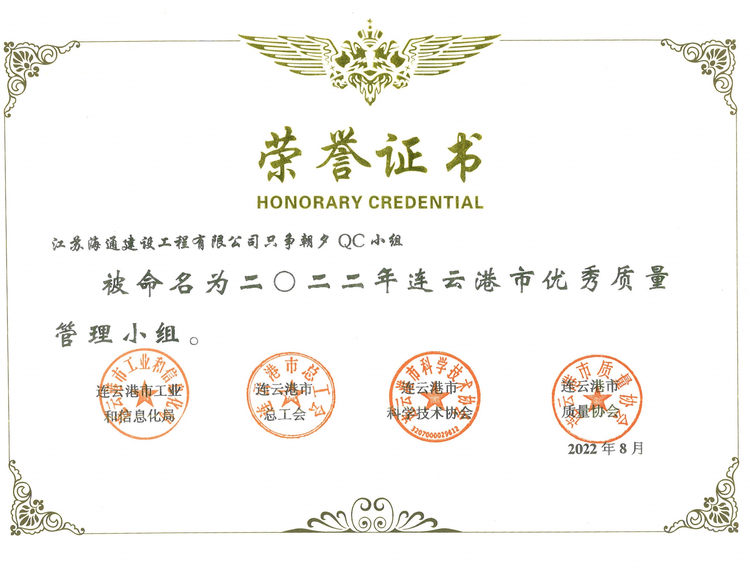日前,從連云港市質(zhì)量協(xié)會獲悉,江蘇海建公司參評的百尺竿頭、頂天立地、金海二路、一路有你、只爭朝夕五個QC活動小組均獲得“2022年度連云港市優(yōu)秀質(zhì)量管理小組”稱號。