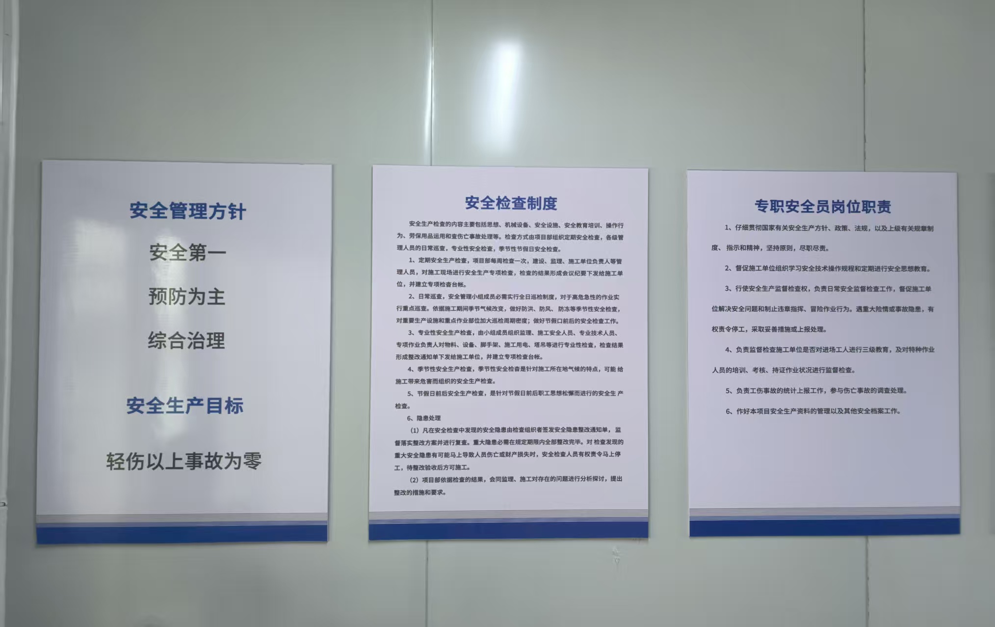 公司結(jié)合實(shí)際梳理安全職責(zé),覆蓋從項(xiàng)目負(fù)責(zé)人到各崗位工作人員的全鏈條責(zé)任,包含施工現(xiàn)場(chǎng)管理、安全監(jiān)督、獎(jiǎng)懲辦法等核心內(nèi)容。這些職責(zé)以醒目展板形式懸掛于辦公室顯眼位置,使工作人員日常隨時(shí)可見(jiàn)自身安全責(zé)任,確保責(zé)任明晰、心中有數(shù)。同步上墻的還有安全檢查制度,明確規(guī)定檢查頻率、內(nèi)容、標(biāo)準(zhǔn)及問(wèn)題整改流程。制度涵蓋日常施工現(xiàn)場(chǎng)巡查、定期專項(xiàng)安全檢查、季節(jié)性安全隱患排查等場(chǎng)景。對(duì)檢查發(fā)現(xiàn)的問(wèn)題,實(shí)行責(zé)任到人、限時(shí)整改機(jī)制,并嚴(yán)格執(zhí)行復(fù)查驗(yàn)收,形成閉環(huán)管理。