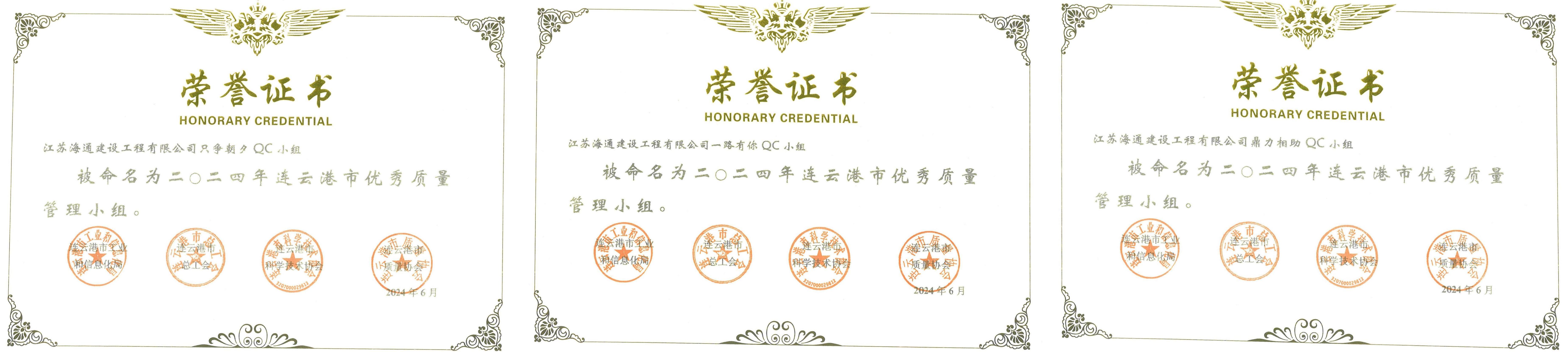 近日,據(jù)連工信發(fā)〔2024〕76號文《關(guān)于表彰2024年連云港市優(yōu)秀質(zhì)量管理小組、質(zhì)量信得過班組、優(yōu)秀企業(yè)、卓越領(lǐng)導(dǎo)者、優(yōu)秀推進(jìn)者的通知》,江蘇海建公司只爭朝夕QC小組、一路有你QC小組、鼎力相助QC小組榮獲2024年連云港市優(yōu)秀質(zhì)量管理小組。