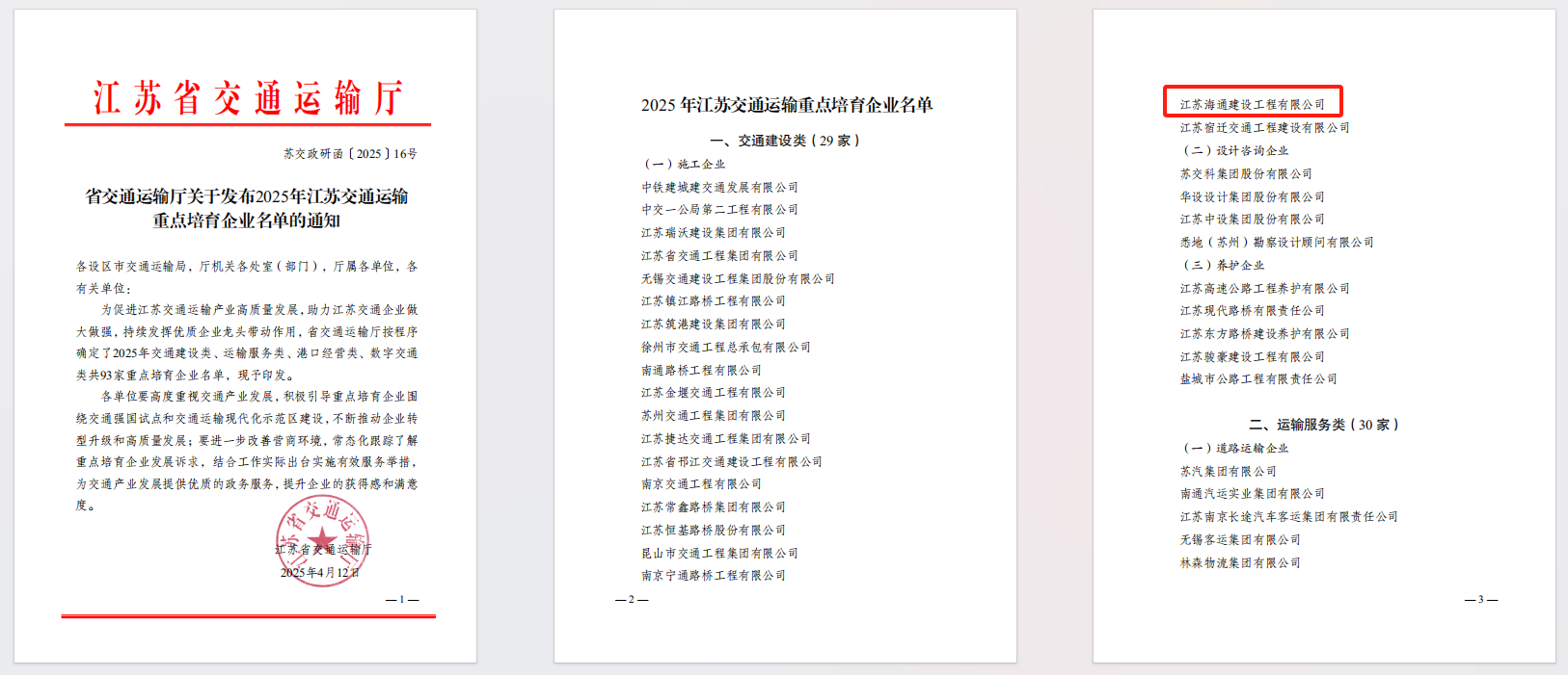 近日,從江蘇省交通運(yùn)輸廳獲悉,江蘇海建公司入選2025年江蘇交通運(yùn)輸重點(diǎn)培育企業(yè)名單,位列交通建設(shè)類施工企業(yè)20強(qiáng)。