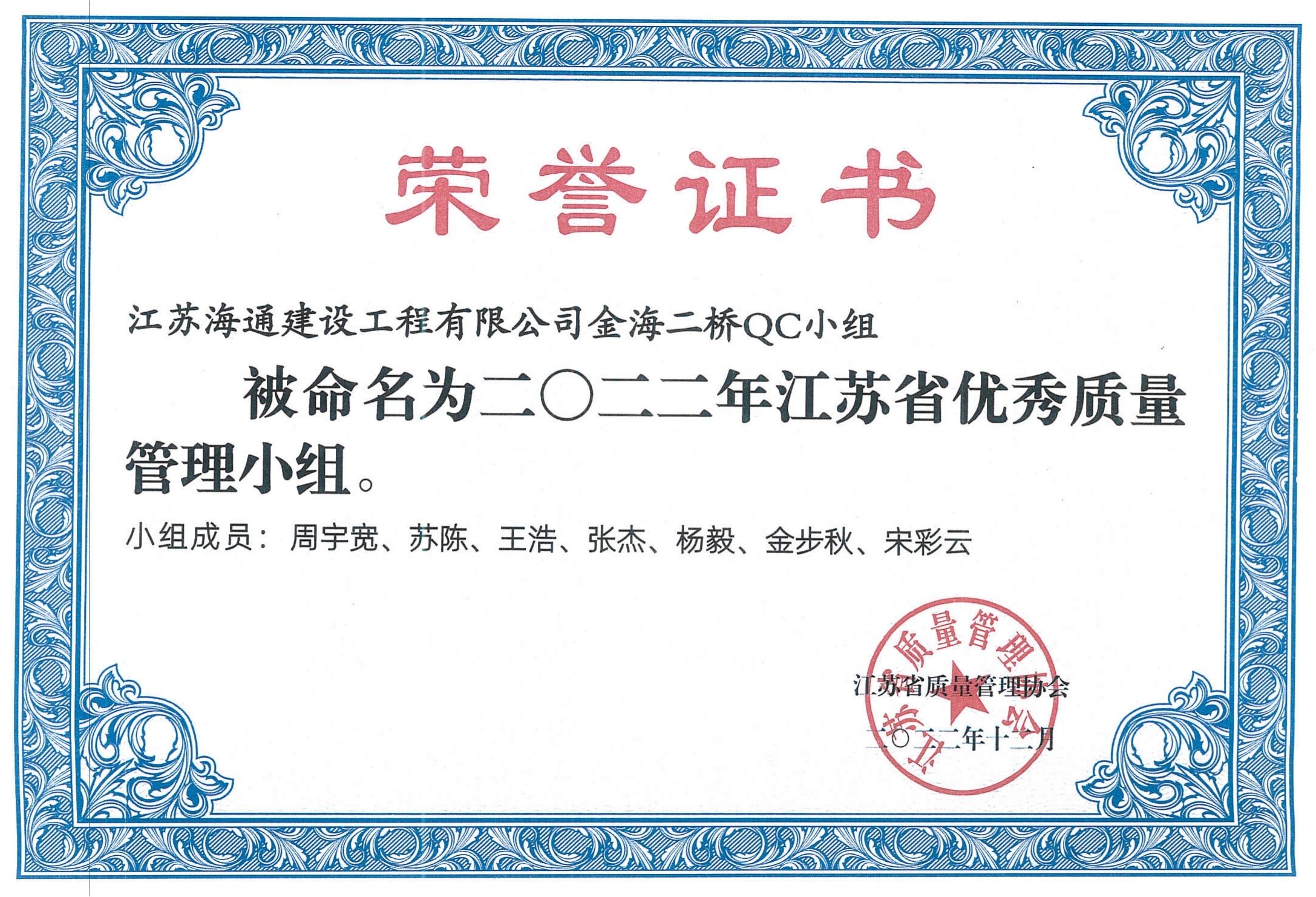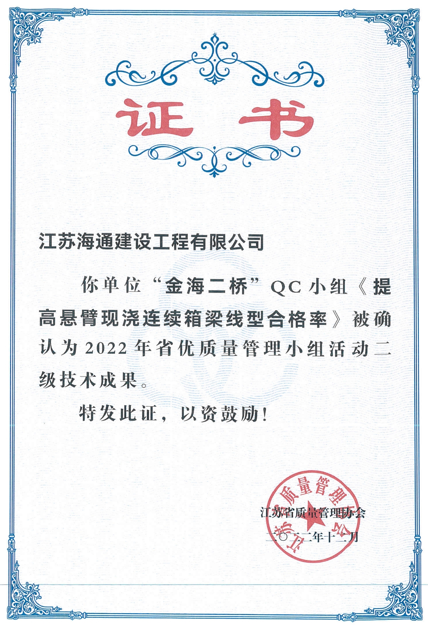 近日,從連云港市質(zhì)量協(xié)會(huì)獲悉,江蘇海建金海二橋QC小組成果《提高懸臂箱梁連續(xù)澆筑線型合格率》榮獲“2022年省優(yōu)質(zhì)量管理小組活動(dòng)二級技術(shù)成果”,同時(shí),金海二橋QC小組榮獲“2022年江蘇省優(yōu)秀質(zhì)量管理小組”。