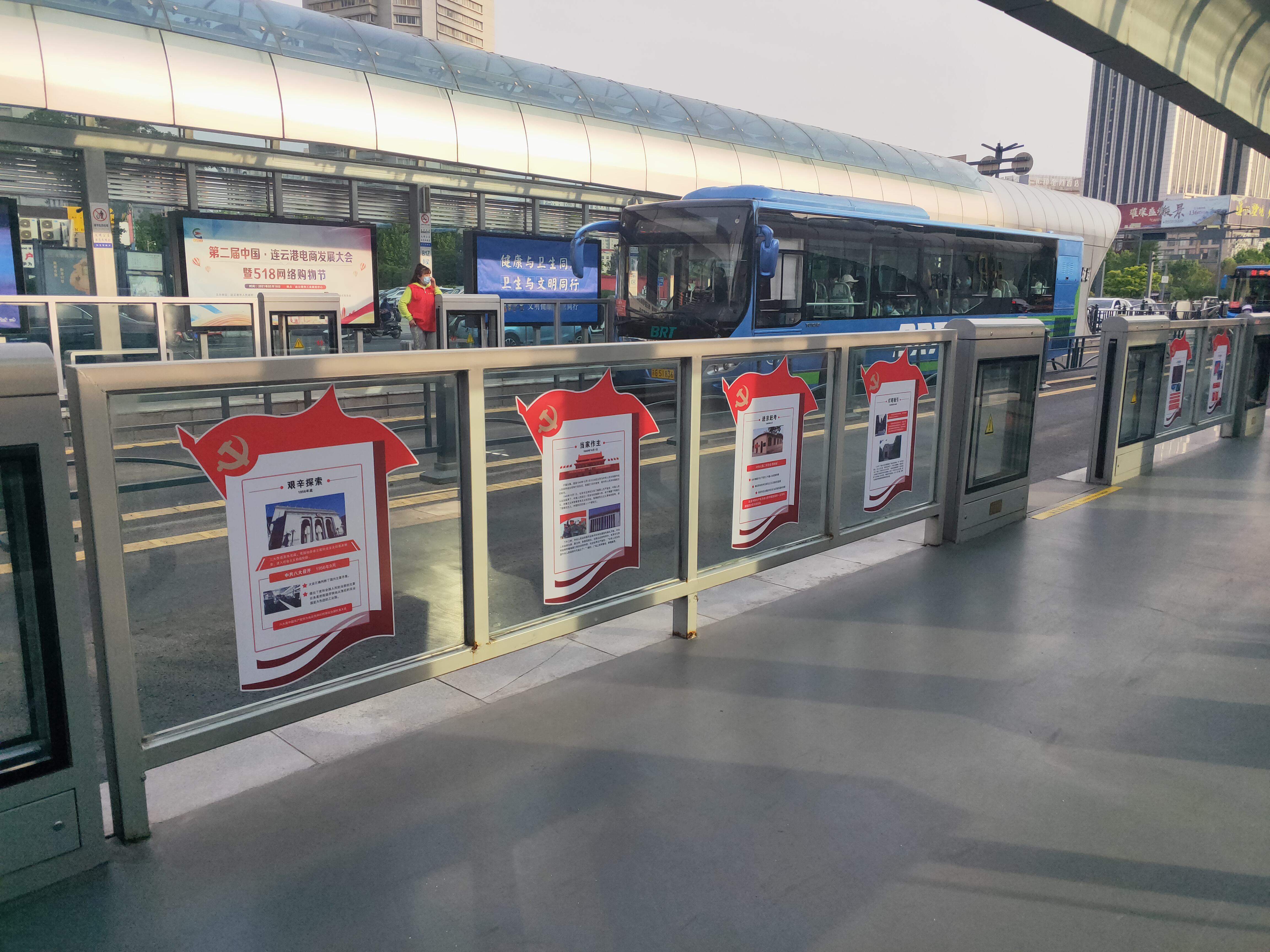 為慶祝建黨百年、踐行黨史學(xué)習(xí)教育,依托BRT站臺(tái)“窗口”優(yōu)勢(shì)和BRT“馨驛站”的打造,快速公交事業(yè)部在龍河廣場(chǎng)下行站推出一款黨史學(xué)習(xí)教育主題站臺(tái)。根據(jù)乘客視角習(xí)慣,在站臺(tái)的燈廂、安全門側(cè)玻、頂部、墻面等醒目位置進(jìn)行立體設(shè)計(jì)。以中國(guó)共產(chǎn)黨黨史為主要內(nèi)容,紅黃為主基調(diào)進(jìn)行氛圍渲染,濃淡相宜與站臺(tái)環(huán)境相得益彰。乘客在耳濡目染中接受教育,增強(qiáng)時(shí)代的自豪感。