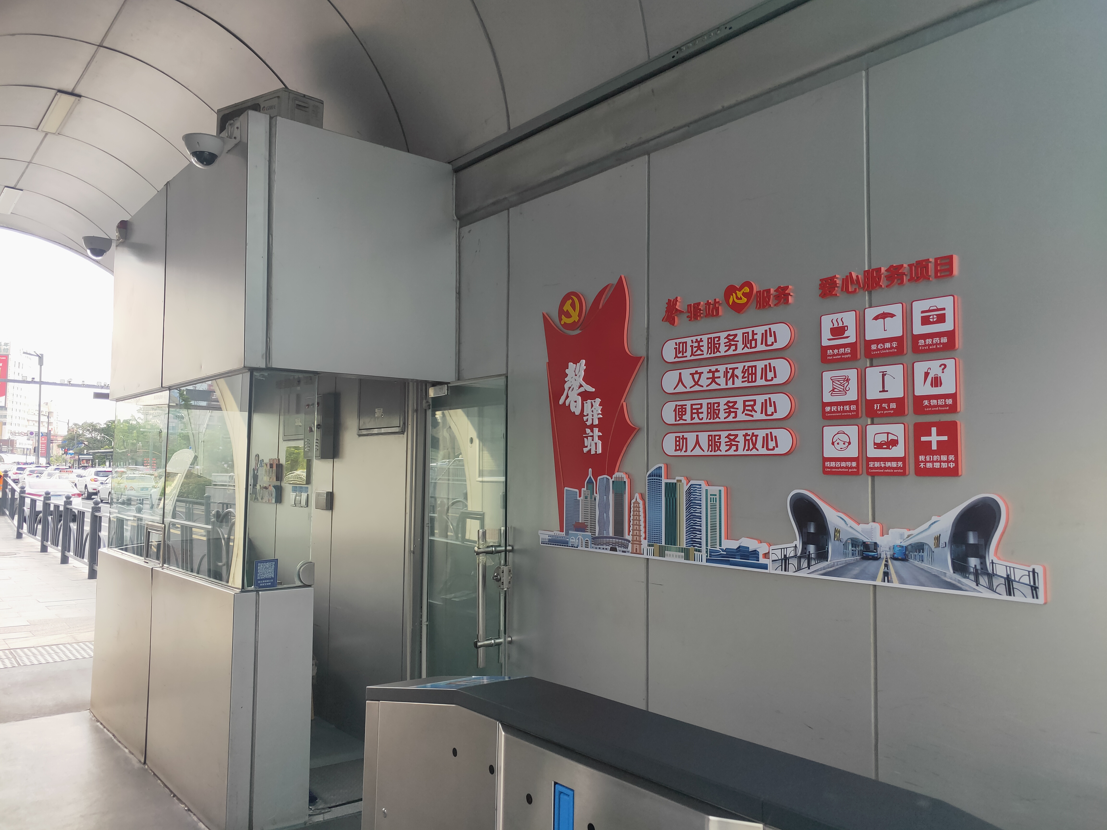 黨史站臺(tái)在城市中充分發(fā)揮著風(fēng)景線作用,站臺(tái)燈廂反面以黨史學(xué)習(xí)教育標(biāo)語(yǔ)為重點(diǎn),驕傲地向來(lái)往車輛人群宣傳著“熱烈慶祝中國(guó)共產(chǎn)黨成立100周年”。出站后站房墻面BRT“馨驛站”一定會(huì)吸引我們的目光:“馨驛站”服務(wù)內(nèi)容、服務(wù)理念無(wú)不詮釋著快速站務(wù)班組以黨建為引領(lǐng),積極踐行“善小常為,服務(wù)便民”的理念。