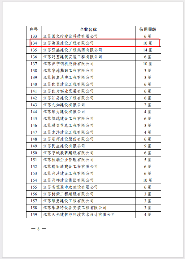 近日,從中國施工企業(yè)管理協(xié)會(簡稱“中施企協(xié)”)獲悉,海建公司入選2024年第六批工程建設(shè)企業(yè)信用10星級認(rèn)定名單,較之22年再增2星。