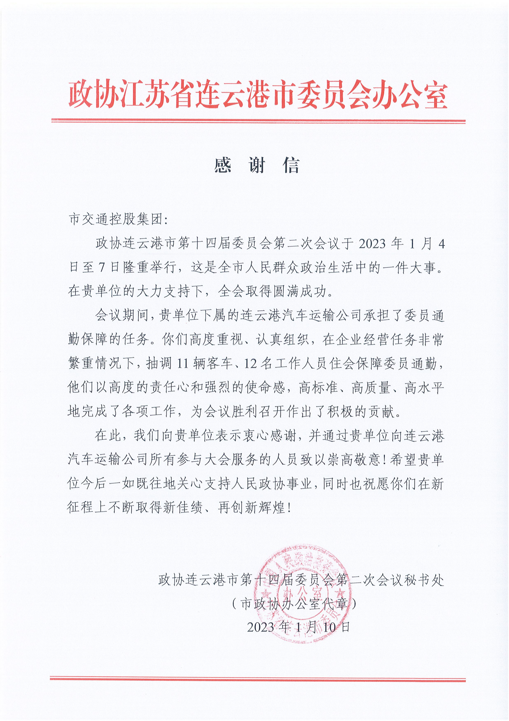 近日,從市交通控股集團(tuán)獲悉,政協(xié)連云港市第十四屆委員會第二次會議秘書處發(fā)來感謝信,對汽車公司在第十四屆委員會第二次會議中的交通保障工作表示衷心感謝,對公司所有參與大會服務(wù)的人員致以崇高的敬意。