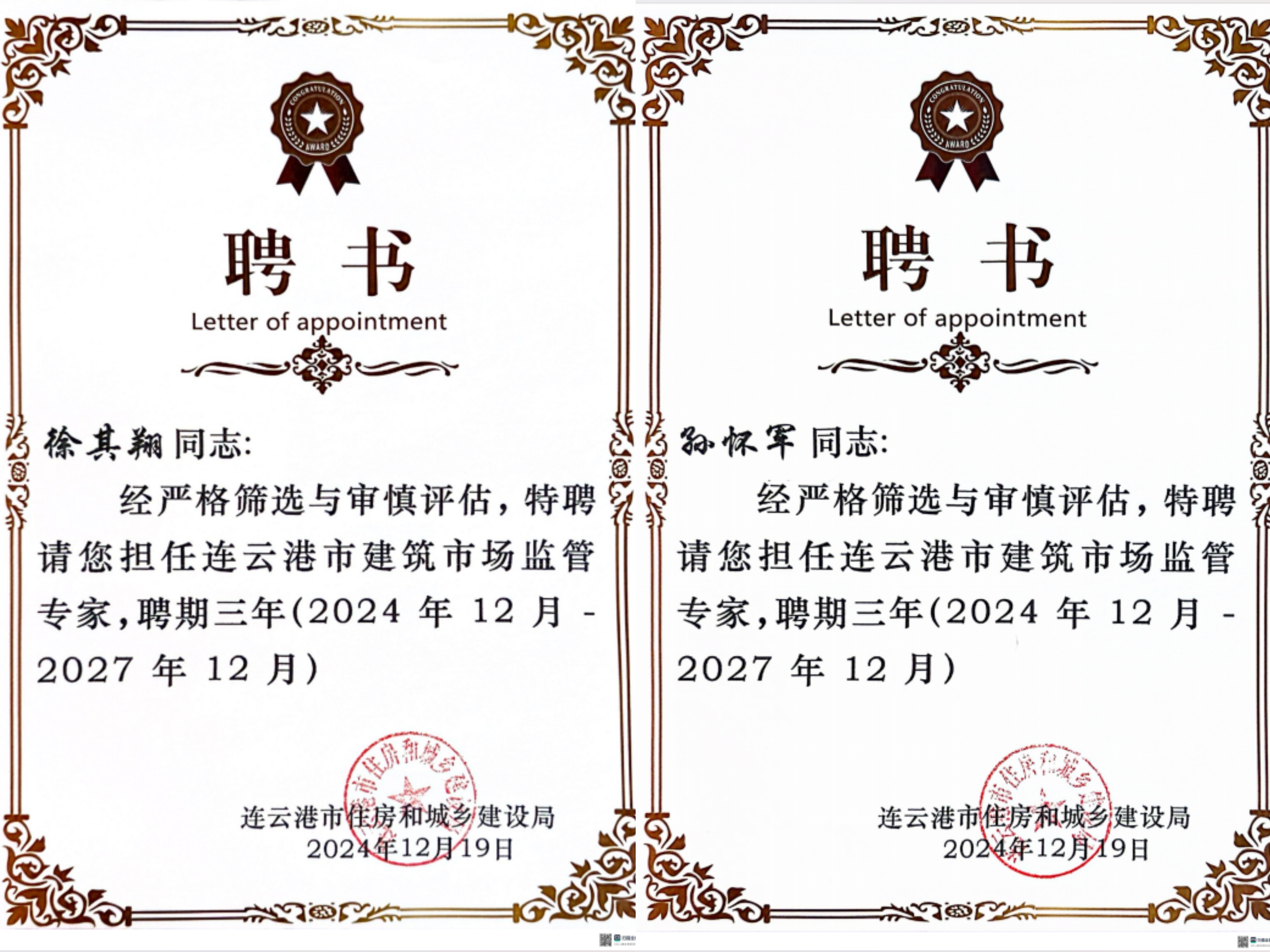 近日,市住建局組織召開連云港市建筑行業(yè)委員會成立暨行業(yè)專家聘任儀式大會,江蘇海建公司徐其翔、孫懷軍被聘為連云港市建筑市場監(jiān)管專家。